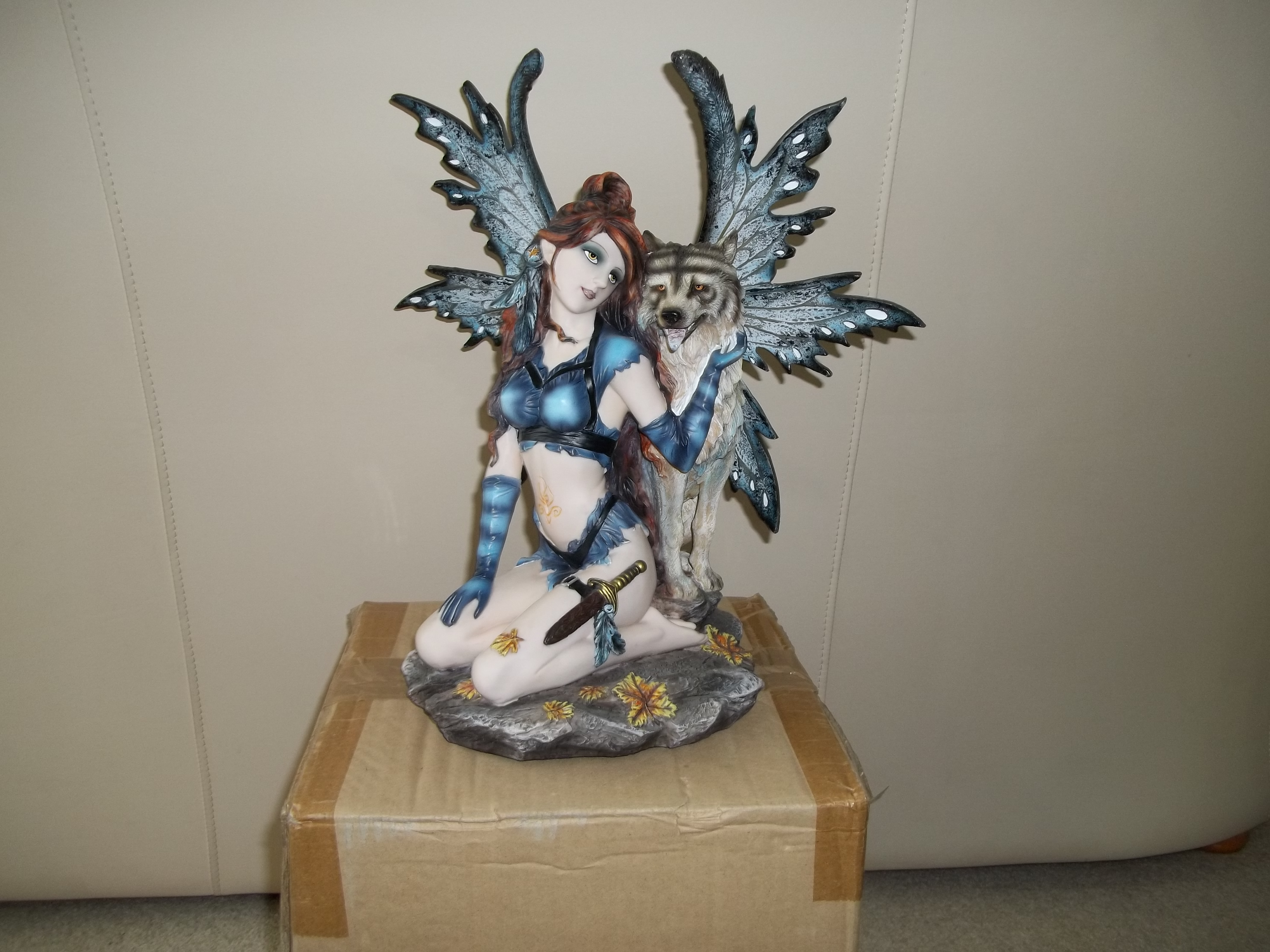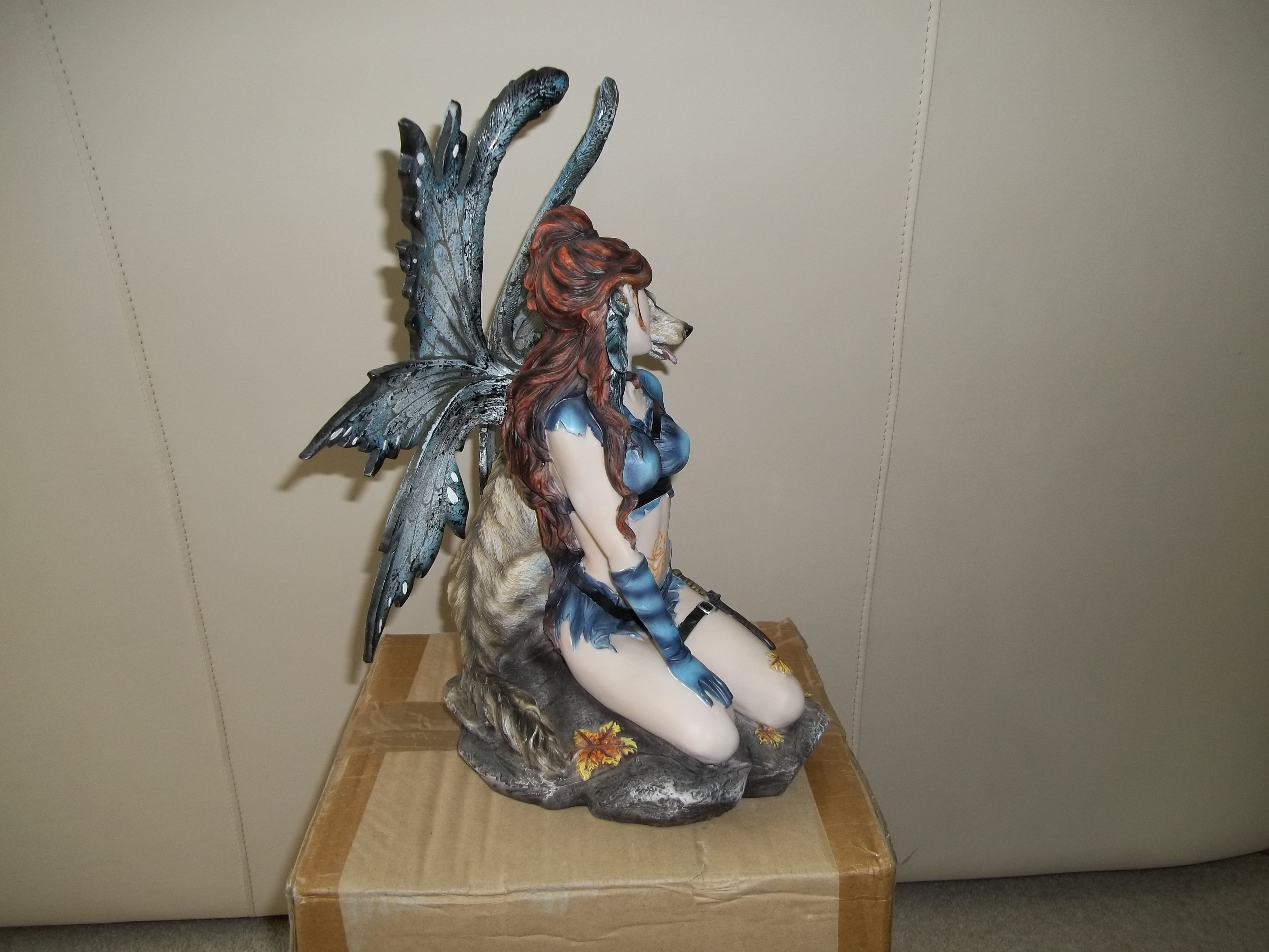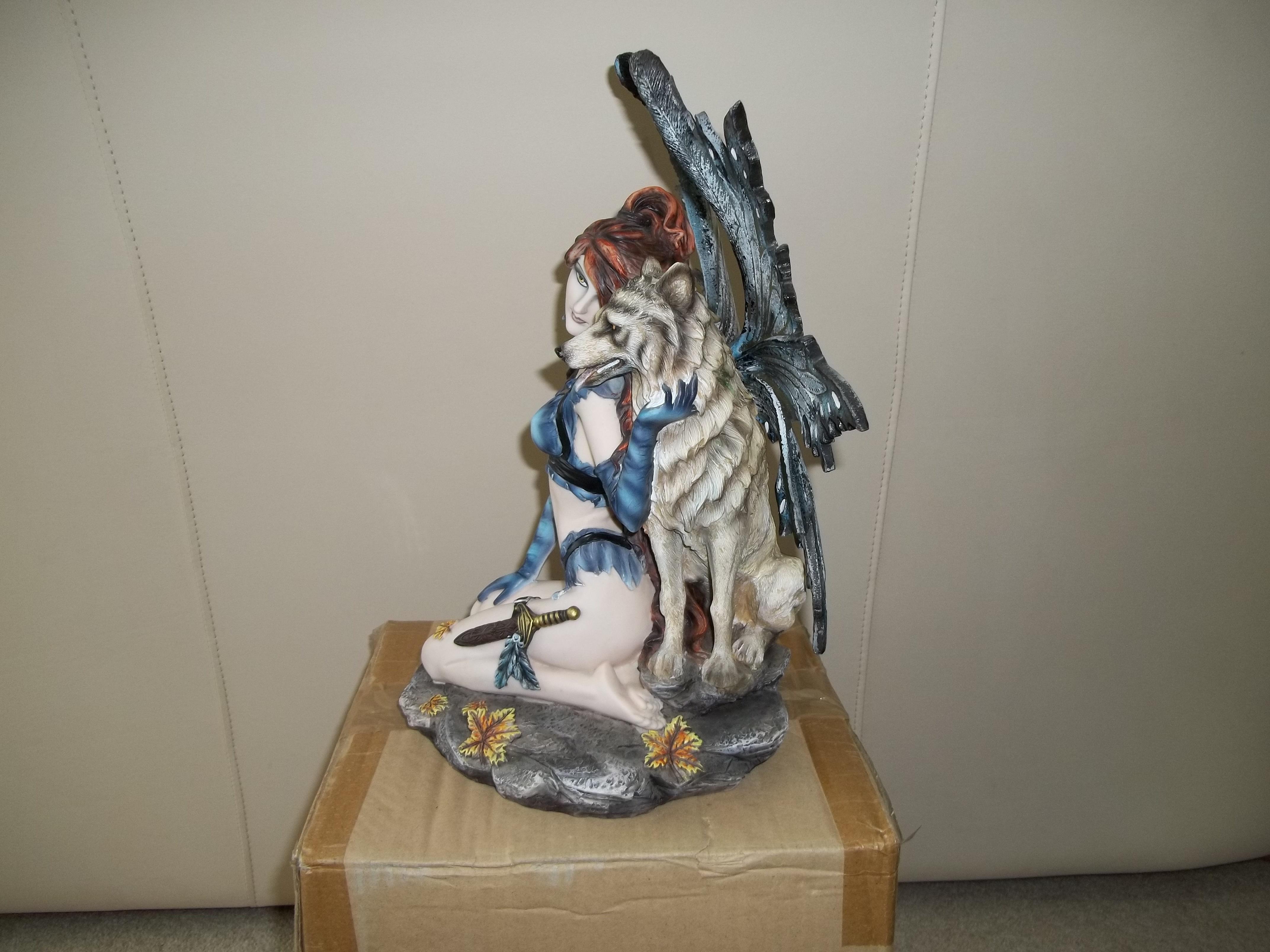 Wolf Mistress Celeste is sitting down so is not as tall as the standing up figurines - but is the same scale. She is armed with a small knife. This figurine is retired.